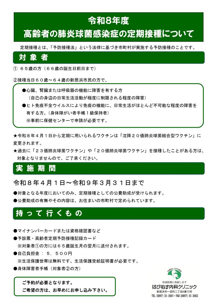 はぴねす内科クリニックでは、高齢者の肺炎球菌感染症の予防接種を受け付けております。