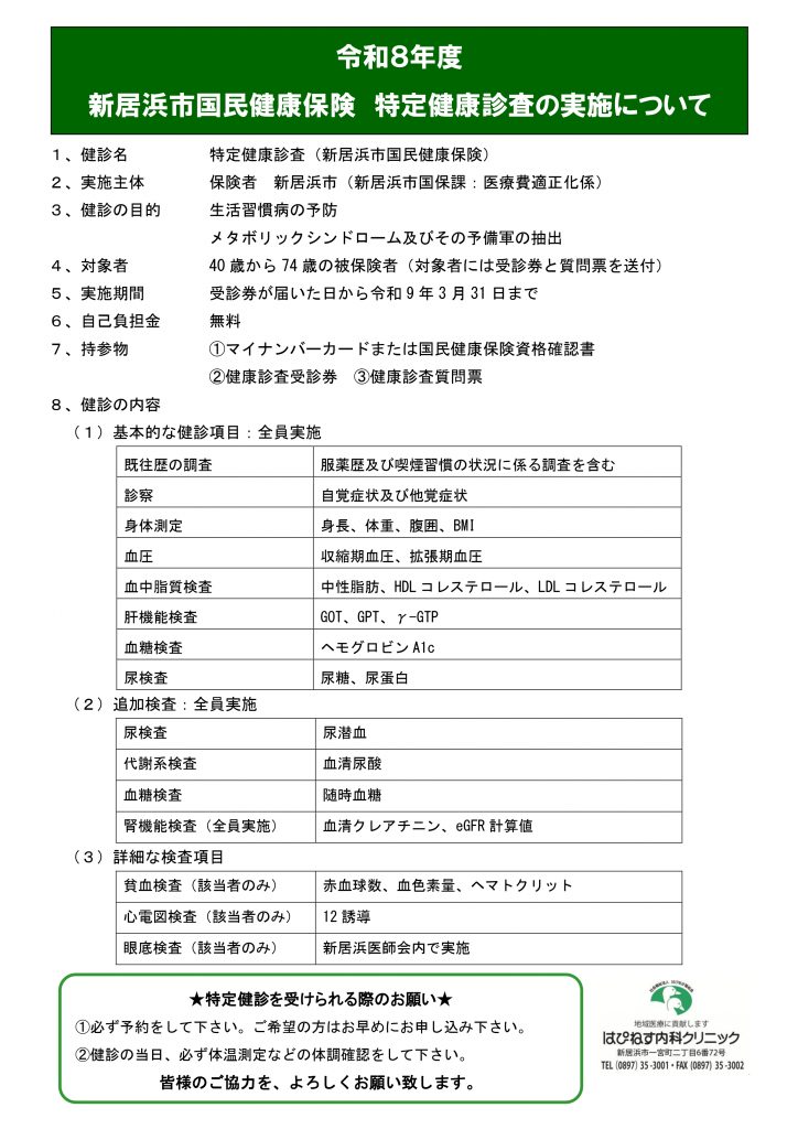 令和8年度新居浜市国民健康保険特定健康診査について